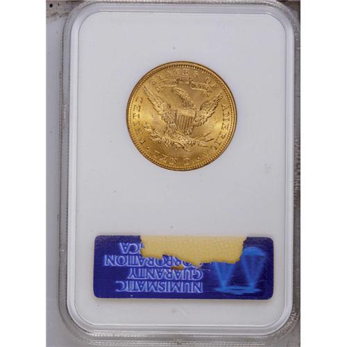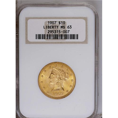 <B>1907<$10> MS63 NGC.</B></I> Well struck with full satiny luster and rich green and orange-gold toning. Numerous superficial abrasions limit the grade.