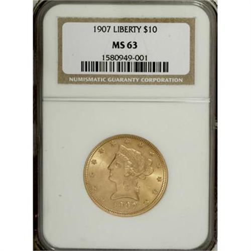 <B>1907 $10 MS63 NGC.</B></I> NGC Census: (4339/779). PCGS Population (2621/463). Mintage: 1,203,973. Numismedia Wsl. Price for NGC/PCGS coin in MS63: $835. (#8763)<BR><BR><B>Coin Engraver:</B> Christian Gobrecht<BR><BR><b>Shipping:</b> Coins & Currency (<a target="_blank" href="http://www.heritageauctions.com/common/shipping.php">view shipping information</a>\)