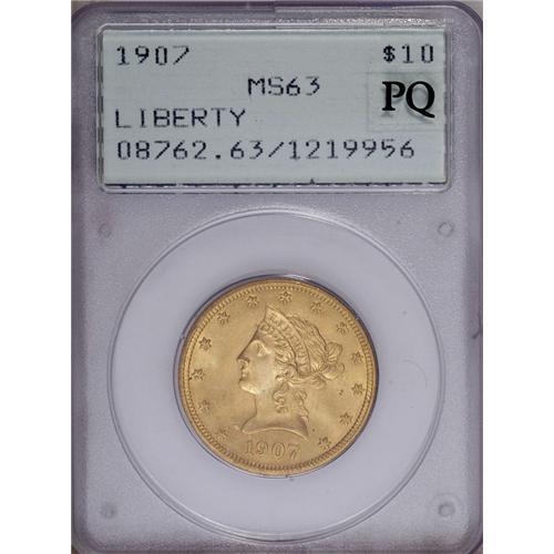 <B>1907 $10 MS63 PCGS.</B></I> A well struck and clearly original apricot-gold Liberty eagle, from the final year of its long-lived series. Quite attractive for the Select grade, and nestled within an early, small-sized PCGS holder.