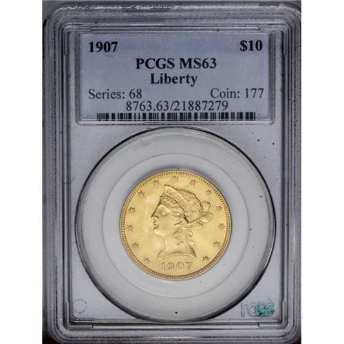 <B>1907<$10> MS63 PCGS.</B></I> The design elements are well brought up, except for weakness in star 13 center. Pleasing luster exudes from apricot-gold surfaces, and the grade is defined by minute abrasions, the most noticeable of which occur in the lower and left (facing) reverse fields.<BR><I>From The Sandia Mountain Collection.</B></I>