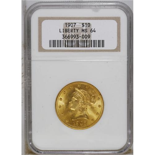 <B>1907 $10 MS64 NGC.</B></I> A lustrous amber-gold near-Gem that has hints of orange on the nicely struck devices. The fields have assorted small marks that account for the grade.<BR><BR><b>Shipping:</b> Coin/Currency (<a target="_blank" href="http://www.heritageauctions.com/common/shipping.php">view shipping information</a>)