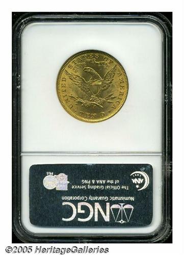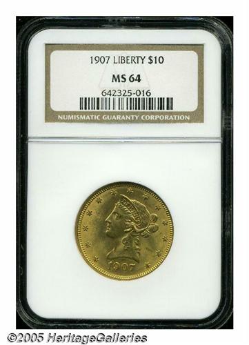 <B>1907<$10> MS64 NGC.</B></I> Lustrous surfaces display peach-gold patina with faint traces of tan, and several small grade-defining marks on Liberty's face and neck, and in the fields of each side. The design elements are well impressed, though the hair above Liberty's ear is a touch soft. NGC and PCGS have seen only 61 pieces finer (4/05).