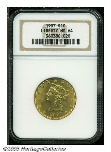 <B>1907<$10> MS64 NGC.</B></I> Lustrous with rich golden color and few appreciable surface marks. Choice quality for this popular, final year Liberty Ten Dollar.