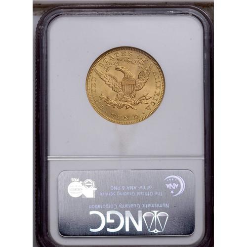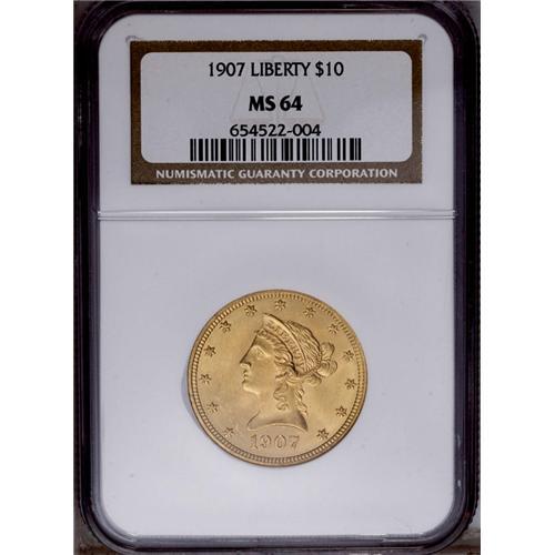 <B>1907<$10> MS64 NGC.</B></I> Rich yellow-gold centers are framed by green-gold tints. This boldly struck final-year Liberty ten exhibits vibrant cartwheel sheen and only a moderate number of faint marks.