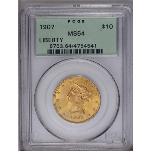 <B>1907 $10 MS64 PCGS.</B></I> Deep orange toning graces this lustrous final-year Liberty ten. A crisply struck and suitably preserved example. PCGS has certified a mere six pieces finer. In a green label holder.