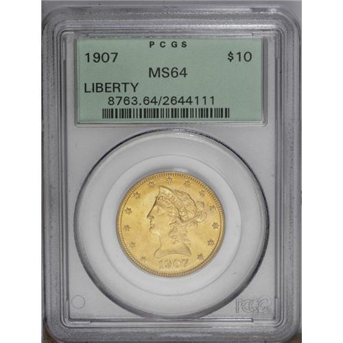 1907 $10 MS64 PCGS. Sharply struck with beautiful, dee