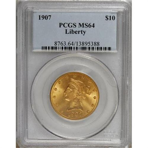 <B>1907 $10 MS64 PCGS.</B></I> A frosty near-Gem example of the final Liberty eagle, this piece has brilliant yellow luster and sharp design details. Although plentiful at this grade level, it is a rarity any finer with just nine better pieces certified by PCGS (6/07).<BR><BR><b>Shipping:</b> Coins & Currency (<a target="_blank" href="http://www.heritageauctions.com/common/shipping.php">view shipping information</a>)