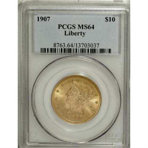<B>1907 $10 MS64 PCGS.</B></I> This well struck green-gold near-Gem has dazzling luster and clean surfaces. The obverse has a couple of tiny and trivial gray spots. 1907 was the end of the line for Gobrecht's Liberty ten design, although the five dollar counterpart was struck for an additional year.<BR><BR><B>Coin Engraver:</B> Christian Gobrecht<BR><BR><b>Shipping:</b> Coins & Currency (<a target="_blank" href="http://www.heritageauctions.com/common/shipping.php">view shipping information</a>)