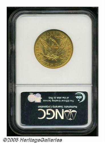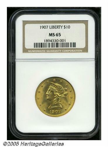 <B>1907<$10> MS65 NGC.</B></I> A splendid final year Coronet Ten Dollar that is endowed with radiant, satiny luster and overlaid in eye catching reddish patina. Just a few inconsequential facial marks are detected upon close inspection. Population: 51 in 65, 5 finer (5/05).