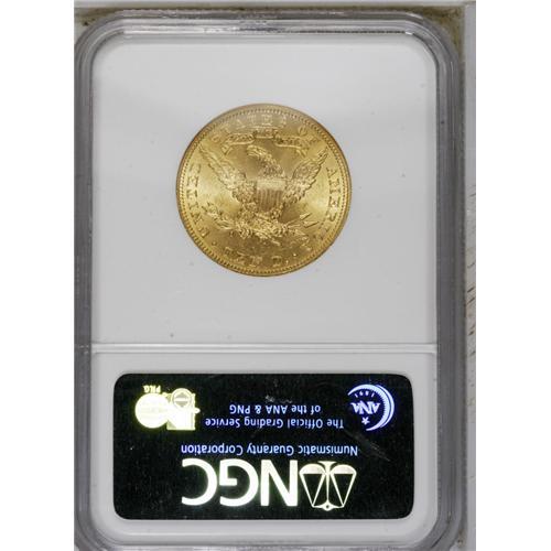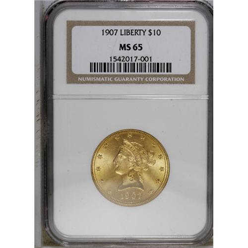 <B>1907<$10> MS65 NGC.</B></I> This Liberty eagle has vivacious luster, and only trivial contact is detected, even upon examination with a loupe. All stars exhibit razor-sharp radials, and the strike is equally penetrating at the centers. 1907 was the final year of the long-lived design, which survived its engraver, Christian Gobrecht, by more than sixty years.