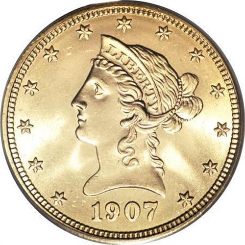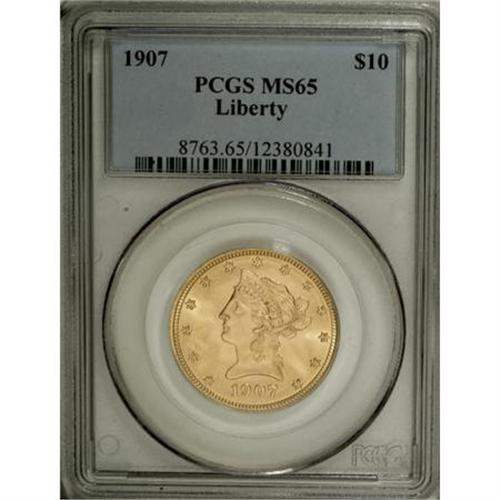 <B>1907 $10 MS65 PCGS.</B></I> This meticulously struck Liberty eagle has booming luster and attractive eye appeal. The 1907 is plentiful in abraded Mint State, but Gems are surprisingly elusive. The Liberty design ended on the eagle and quarter eagle in 1907, although Liberty half eagles were struck in 1908. Population: 21 in 65, 0 finer (3/08).<BR><BR><B>Coin Engraver:</B> Christian Gobrecht<BR><BR><b>Shipping:</b> Coins & Currency (<a target="_blank" href="http://www.heritageauctions.com/common/shipping.php">view shipping information</a>)