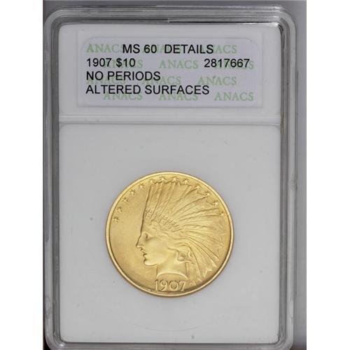 <B>1907 $10 No Motto--Altered Surfaces--ANACS. MS60 Details.</B></I> No Periods. This coin appears to have been lightly whizzed to simulate a higher grade. The telltale outward-moving radial bands and metal buildup around the devices are characteristic, although here not overly distracting, with a matte-like appearance provided by the overall effect.