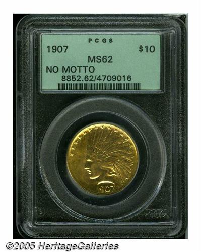 <B>1907<$10> No Motto MS62 PCGS.</B></I> An average strike for the issue with nice luster and typical abrasions for the grade.