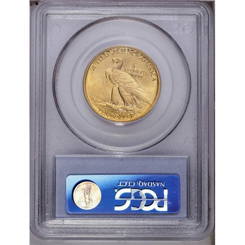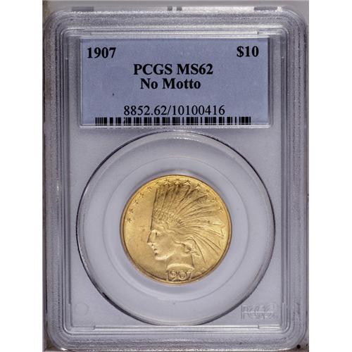 <B>1907<$10> No Motto MS62 PCGS.</B></I> Popular first year of issue. This coin has good yellow-gold luster and a pleasing appearance, save for the myriad amount of grade-limiting abrasions that have accumulated on each side. <BR><BR><B>Important notice:</B> Heritage usually auctions material at the rate of 200-250 lots per hour. On some occasions eBay Live bid software or the Internet may not be able to keep up with the pace of the auction. We recommend placing a realistic absentee bid now as insurance to avoid disappointment. Occasionally the auctioneer may eliminate or reject an eBay Live bid, and the auctioneer may also reopen a lot after the close of the eBay live bidding (usually because we missed an audience bid), and may reject your bid even if it shows you as the winning bidder. By bidding via eBay Live, you agree that Heritage may award the lot to another bidder at its sole discretion under the circumstances described above or any other reasonable circumstances. Since eBay bids are not shown to us until we open the lot on the floor, we treat those bids just like floor bids. In most cases the floor responds before the eBay bid is presented to us, due to Internet lag time, so for consistency we have made it a policy that floor bids are always considered first over tie eBay live bids. Also please note that all Heritage lots purchased through eBay Live carry a 20% Buyer's Premium. Please make sure you read the Terms and Conditions before you bid. This lot is being auctioned in conjunction with a live floor auction by Heritage Galleries & Auctioneers. All final auction and invoice information will be supplied by Heritage Galleries & Auctioneers, and all other information should be considered preliminary. Lot:4090 <BR><BR><B>Winning Notification and Billing:</B> After the FINAL session in this auction is complete, Heritage will send e-mail and snail mail invoices. This process normally takes several days. All final auction and invoice information will be supplied by Heritage Galleries & Auctioneers, and all other information should be considered preliminary. <BR><BR>This auction will be conducted on a live auction floor and over the Internet through eBay Live. If you choose to place an absentee bid, please take a moment to <font color='#0000ff'><u><a href='http://pages.ebay.com/liveauctions/help/before/laabsentee.html'>learn how eBay Live absentee bidding works</a></u></font><font color='#000000'>