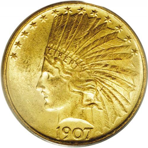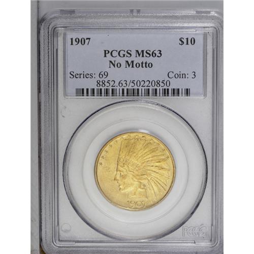 <B>1907<$10> No Motto MS63 PCGS.</B></I> A popular two-year type coin, here represented by a lustrous yellow-gold example, with a bold strike and a few light, grade-consistent abrasions. Extremely eye-appealing! <BR><BR><B>Important notice:</B> Heritage usually auctions material at the rate of 200-250 lots per hour. On some occasions eBay Live bid software or the Internet may not be able to keep up with the pace of the auction. We recommend placing a realistic absentee bid now as insurance to avoid disappointment. Occasionally the auctioneer may eliminate or reject an eBay Live bid, and the auctioneer may also reopen a lot after the close of the eBay live bidding (usually because we missed an audience bid), and may reject your bid even if it shows you as the winning bidder. By bidding via eBay Live, you agree that Heritage may award the lot to another bidder at its sole discretion under the circumstances described above or any other reasonable circumstances. Since eBay bids are not shown to us until we open the lot on the floor, we treat those bids just like floor bids. In most cases the floor responds before the eBay bid is presented to us, due to Internet lag time, so for consistency we have made it a policy that floor bids are always considered first over tie eBay live bids. Also please note that all Heritage lots purchased through eBay Live carry a 20% Buyer's Premium. Please make sure you read the Terms and Conditions before you bid. This lot is being auctioned in conjunction with a live floor auction by Heritage Galleries & Auctioneers. All final auction and invoice information will be supplied by Heritage Galleries & Auctioneers, and all other information should be considered preliminary. Lot:4096 <BR><BR><B>Winning Notification and Billing:</B> After the FINAL session in this auction is complete, Heritage will send e-mail and snail mail invoices. This process normally takes several days. All final auction and invoice information will be supplied by Heritage Galleries & Auctioneers, and all other information should be considered preliminary. <BR><BR>This auction will be conducted on a live auction floor and over the Internet through eBay Live. If you choose to place an absentee bid, please take a moment to <font color='#0000ff'><u><a href='http://pages.ebay.com/liveauctions/help/before/laabsentee.html'>learn how eBay Live absentee bidding works</a></u></font><font color='#000000'>