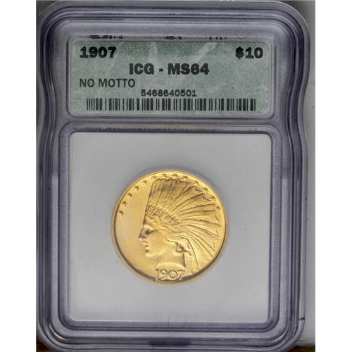 <B>1907<$10> No Motto MS64 ICG.</B></I> Bright lemon-gold color with creamy luster and a good strike. Thorough evaluation is required to locate even miniscule marks. Boldly impressed aside from the customary slight softness on the right (facing) claw and nearby branch. 1907 began a decade of change that replaced all circulating designs aside from the silver dollar, which was not coined during the period.