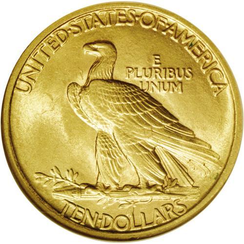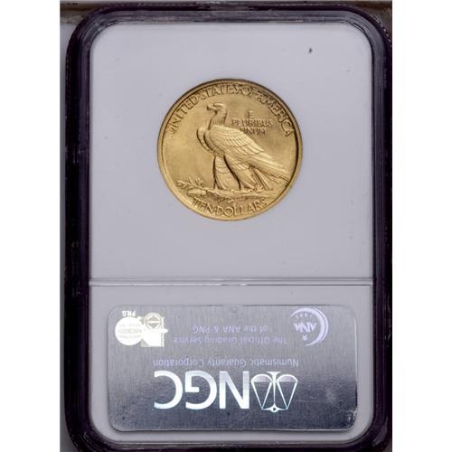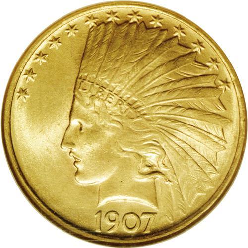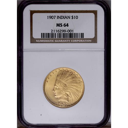 <B>1907<$10> No Motto MS64 NGC.</B></I> Because 1907 was the first year of issue, many were saved as keepsakes, which accounts for the relatively large number of better-grade Uncirculated coins around today. Indeed, nearly 1,000 near-Gems have been certified by NGC and PCGS combined. This example displays fully lustrous, apricot-gold surfaces with tinges of light green undertones. The design elements are adequately brought up, though portions of the Indian's hair are soft. The grade is defined by minute marks on the cheek, on the eagle's upper breast, and in the upper left (facing) reverse field. A couple of minor rim marks on the right (facing) obverse are also mentioned for accuracy.