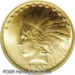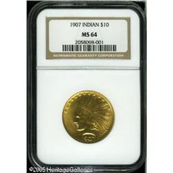 <B>1907 $10 No Motto MS64 NGC.</B></I> Bright champagne-gold in color. A flashy near-Gem with nearly unblemished surfaces and impressive eye appeal. The fields have a faint orange-peel texture, as struck due to the later die state. A splendid representative of this short-lived type. One of only two coin designs credited to Augustus Saint-Gaudens, who for several decades was the foremost American sculptor. Lot:8850