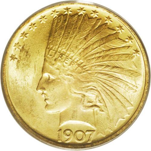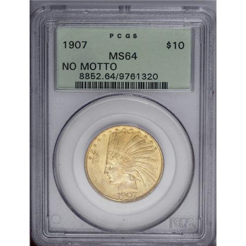 <B>1907 $10 No Motto MS64 PCGS.</B></I> A beautiful representation of this first-year issue. Colorful yellow-gold and rose-gold surfaces combine with frosty, original luster and give this coin tremendous eye appeal.