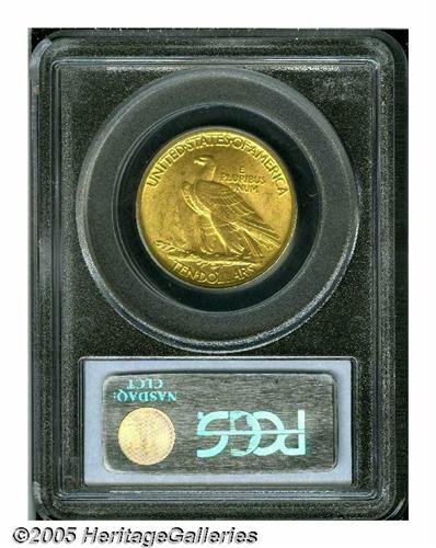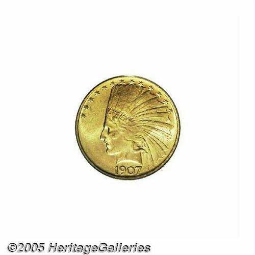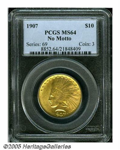 <B>1907<$10> No Motto MS64 PCGS.</B></I> Lemon and olive-gold hues confirm the originality of this lustrous and crisply struck near-Gem. Only the occasional wispy mark precludes an even finer assessment. The No Motto type was only struck for parts of 1907 and 1908, and since the other No Motto dates are scarce in Mint State, the 1907 is often called upon to represent the short-lived type.