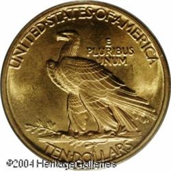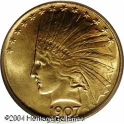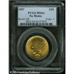 1907 $10 No Motto MS64 PCGS. This coin is an uncom <B>1907 $10 No Motto MS64 PCGS.</B></I> This coin is an uncommonly well preserved representative of this first-year Indian Eagle that is relatively easy to obtain in lower grades. Rich yellow-gold color envelops fully lustrous, satiny textured surfaces. Both the obverse and reverse are smooth enough to warrant consideration at an even higher grade level. A very attractive coin with sharp striking definition for the type. <BR><BR><B>Important notice:</B> Heritage usually auctions material at the rate of 200-250 lots per hour. On some occasions eBay Live bid software or the Internet may not be able to keep up with the pace of the auction. We recommend placing a realistic absentee bid now as insurance to avoid disappointment. Occasionally the auctioneer may eliminate or reject an eBay Live bid, and the auctioneer may also reopen a lot after the close of the eBay live bidding (usually because we missed an audience bid), and may reject your bid even if it shows you as the winning bidder. By bidding via eBay Live, you agree that Heritage may award the lot to another bidder at its sole discretion under the circumstances described above or any other reasonable circumstances. Since eBay bids are not shown to us until we open the lot on the floor, we treat those bids just like floor bids. In most cases the floor responds before the eBay bid is presented to us, due to Internet lag time, so for consistency we have made it a policy that floor bids are always considered first over tie eBay live bids. Also please note that all Heritage lots purchased through eBay Live carry a 20% Buyer's Premium. Please make sure you read the Terms and Conditions before you bid. This lot is being auctioned in conjunction with a live floor auction by Heritage Galleries & Auctioneers. All final auction and invoice information will be supplied by Heritage Galleries & Auctioneers, and all other information should be considered preliminary. Lot:6797