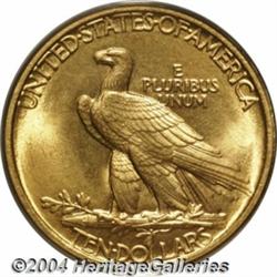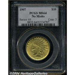 <B>1907<$10> No Motto MS64 PCGS.</B></I> Luminous honey-gold color, unmarked fields, and satiny cartwheel luster affirm the quality of this crisply struck near-Gem. The obverse is devoid of any noticeable contact, and the reverse is nearly as attractive. Struck only in late 1907 and early 1908, the No Motto type is scarce, and is found in higher grades far less often than its Double Eagle counterpart. The sizable majority of Uncirculated 1907 Indian Eagles grade between MS61 and MS63. <BR><BR><B>Important notice:</B> Heritage usually auctions material at the rate of 200-250 lots per hour. On some occasions eBay Live bid software or the Internet may not be able to keep up with the pace of the auction. We recommend placing a realistic absentee bid now as insurance to avoid disappointment. Occasionally the auctioneer may eliminate or reject an eBay Live bid, and the auctioneer may also reopen a lot after the close of the eBay live bidding (usually because we missed an audience bid), and may reject your bid even if it shows you as the winning bidder. By bidding via eBay Live, you agree that Heritage may award the lot to another bidder at its sole discretion under the circumstances described above or any other reasonable circumstances. Since eBay bids are not shown to us until we open the lot on the floor, we treat those bids just like floor bids. In most cases the floor responds before the eBay bid is presented to us, due to Internet lag time, so for consistency we have made it a policy that floor bids are always considered first over tie eBay live bids. Also please note that all Heritage lots purchased through eBay Live carry a 20% Buyer's Premium. Please make sure you read the Terms and Conditions before you bid. </span></font></tr></table></td></tr></table>