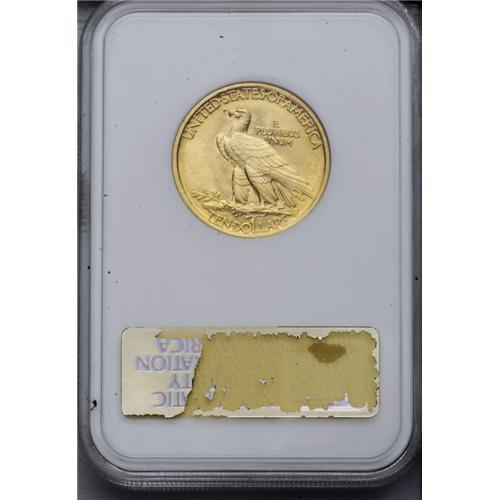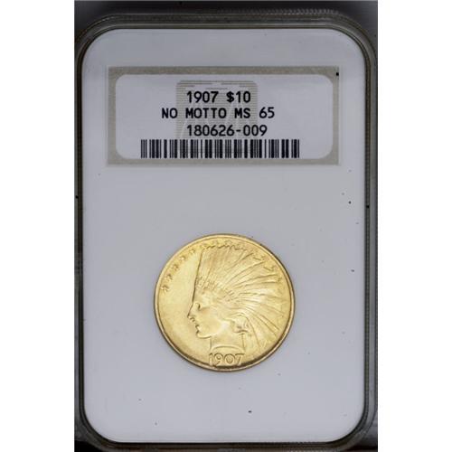 <B>1907<$10> No Motto MS65 NGC.</B></I> As 1907 was the first year of issue, many were saved as souvenirs or keepsakes, accounting for the relatively large number of Mint State coins extant today. Indeed, around 6,000 Uncirculated examples have been certified by NGC and PCGS combined. Full Gem pieces, while not rare, are challenging. The current MS65 specimen displays highly lustrous, apricot-gold surfaces. The design features are well brought up, and the surfaces are devoid of significant contact marks. A few small marks are noted on the rims of both sides. <BR><BR><B>Important notice:</B> Heritage usually auctions material at the rate of 200-250 lots per hour. On some occasions eBay Live bid software or the Internet may not be able to keep up with the pace of the auction. We recommend placing a realistic absentee bid now as insurance to avoid disappointment. Occasionally the auctioneer may eliminate or reject an eBay Live bid, and the auctioneer may also reopen a lot after the close of the eBay live bidding (usually because we missed an audience bid), and may reject your bid even if it shows you as the winning bidder. By bidding via eBay Live, you agree that Heritage may award the lot to another bidder at its sole discretion under the circumstances described above or any other reasonable circumstances. Since eBay bids are not shown to us until we open the lot on the floor, we treat those bids just like floor bids. In most cases the floor responds before the eBay bid is presented to us, due to Internet lag time, so for consistency we have made it a policy that floor bids are always considered first over tie eBay live bids. Also please note that all Heritage lots purchased through eBay Live carry a 20% Buyer's Premium. Please make sure you read the Terms and Conditions before you bid. This lot is being auctioned in conjunction with a live floor auction by Heritage Galleries & Auctioneers. All final auction and invoice information will be supplied by Heritage Galleries & Auctioneers, and all other information should be considered preliminary. Lot:4097 <BR><BR><B>Winning Notification and Billing:</B> After the FINAL session in this auction is complete, Heritage will send e-mail and snail mail invoices. This process normally takes several days. All final auction and invoice information will be supplied by Heritage Galleries & Auctioneers, and all other information should be considered preliminary. <BR><BR>This auction will be conducted on a live auction floor and over the Internet through eBay Live. If you choose to place an absentee bid, please take a moment to <font color='#0000ff'><u><a href='http://pages.ebay.com/liveauctions/help/before/laabsentee.html'>learn how eBay Live absentee bidding works</a></u></font><font color='#000000'>