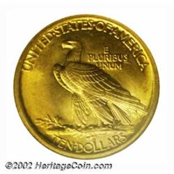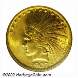 1907 $10 No Motto MS65 NGC. The 1907 No Motto Ten Dollar is undoubtedly one of the best produced and most visually appealing coins struck in the 20th century. The surfaces on this piece have bright, shimmering satin-like luster and are virtually unaffected by post-striking impairments. The flashy yellow-gold color of the coin is enhanced by a faint accent of reddish patina around the margins. An outstanding type coin. Accompanied by an NGC Photo Proof. Important notice: We expect to be auctioning lots at the rate of 200-250 per hour. Sometimes eBay Premier live bid software cannot keep up with that pace, so we strongly recommend that you place a realistic proxy bid now as insurance to avoid disappointment. Also please note that all Heritage/CAA lots purchased through eBay Premier carry a 20% Buyer's Premium. Please make sure you read the Terms and Conditions.
