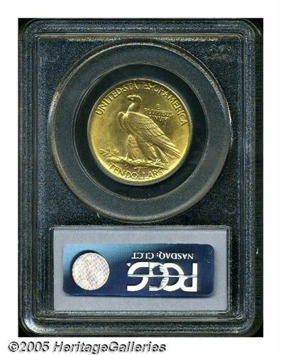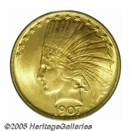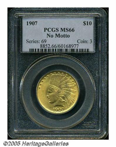 <B>1907<$10> No Motto MS66 PCGS.</B></I> Satiny and brilliant. A spectacular and thoroughly delightful example of the issue. Although the 1907 isn't particularly scarce in the MS-60 to 64 range, only a tiny percentage of the Mint State survivors could match the quality offered here. The 1907 is particularly popular because of its status as a two-year design type. Suitable for inclusion in the ultimate type set or date collection. Population: 49 in 66, 4 finer (4/05).