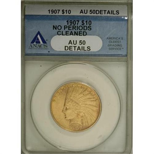 <B>1907 $10 No Periods--Cleaned--ANACS. AU50 Details.</B></I> NGC Census: (4/4671). PCGS Population (37/4685). Mintage: 239,400. Numismedia Wsl. Price for NGC/PCGS coin in AU50: $585. (#8852)<BR><BR><B>Coin Engraver:</B> Augustus Saint-Gaudens<BR><BR><b>Shipping:</b> Coins & Currency (<a target="_blank" href="http://www.heritageauctions.com/common/shipping.php">view shipping information</a>)