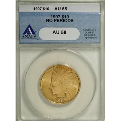 <B>1907 $10 No Periods AU58 ANACS.</B></I> NGC Census: (544/3961). PCGS Population (650/3690). Mintage: 239,400. Numismedia Wsl. Price for NGC/PCGS coin in AU58: $550. (#8852)<BR><BR><B>Coin Engraver:</B> Augustus Saint-Gaudens<BR><BR><b>Shipping:</b> Coins & Currency (<a target="_blank" href="http://www.heritageauctions.com/common/shipping.php">view shipping information</a>)