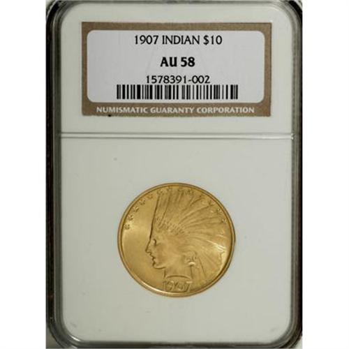 <B>1907 $10 No Periods AU58 NGC.</B></I> NGC Census: (540/3915). PCGS Population (647/3677). Mintage: 239,400. Numismedia Wsl. Price for NGC/PCGS coin in AU58: $550. (#8852)<BR><BR><B>Coin Engraver:</B> Augustus Saint-Gaudens<BR><BR><b>Shipping:</b> Coins & Currency (<a target="_blank" href="http://www.heritageauctions.com/common/shipping.php">view shipping information</a>)
