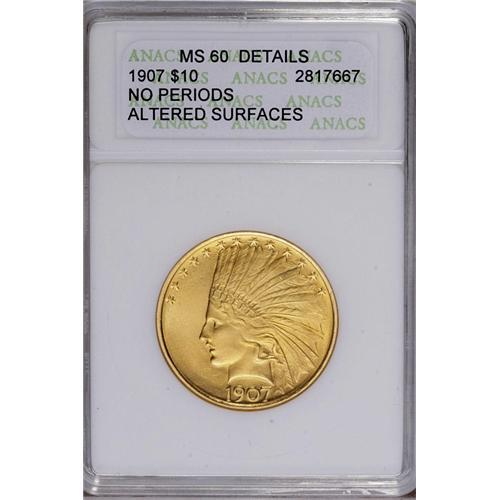 <B>1907<$10> No Motto--Altered Surfaces--ANACS. MS60 Details.</B></I> This coin appears to have been lightly whizzed to simulate a higher grade. The telltale outward-moving radial bands and metal buildup around the devices are characteristic, although here not overly distracting, with a matte-like appearance provided by the overall effect. <BR><BR><B>Important notice:</B> Heritage usually auctions material at the rate of 200-250 lots per hour. On some occasions eBay Live bid software or the Internet may not be able to keep up with the pace of the auction. We recommend placing a realistic absentee bid now as insurance to avoid disappointment. Occasionally the auctioneer may eliminate or reject an eBay Live bid, and the auctioneer may also reopen a lot after the close of the eBay live bidding (usually because we missed an audience bid), and may reject your bid even if it shows you as the winning bidder. By bidding via eBay Live, you agree that Heritage may award the lot to another bidder at its sole discretion under the circumstances described above or any other reasonable circumstances. Since eBay bids are not shown to us until we open the lot on the floor, we treat those bids just like floor bids. In most cases the floor responds before the eBay bid is presented to us, due to Internet lag time, so for consistency we have made it a policy that floor bids are always considered first over tie eBay live bids. Also please note that all Heritage lots purchased through eBay Live carry a 20% Buyer's Premium. Please make sure you read the Terms and Conditions before you bid. This lot is being auctioned in conjunction with a live floor auction by Heritage Galleries & Auctioneers. All final auction and invoice information will be supplied by Heritage Galleries & Auctioneers, and all other information should be considered preliminary. Lot:4088 <BR><BR><B>Winning Notification and Billing:</B> After the FINAL session in this auction is complete, Heritage will send e-mail and snail mail invoices. This process normally takes several days. All final auction and invoice information will be supplied by Heritage Galleries & Auctioneers, and all other information should be considered preliminary. <BR><BR>This auction will be conducted on a live auction floor and over the Internet through eBay Live. If you choose to place an absentee bid, please take a moment to <font color='#0000ff'><u><a href='http://pages.ebay.com/liveauctions/help/before/laabsentee.html'>learn how eBay Live absentee bidding works</a></u></font><font color='#000000'>