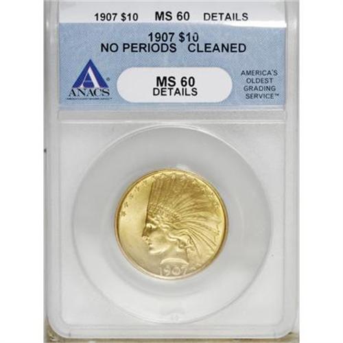 <B>1907 $10 No Periods--Cleaned--ANACS. MS60 Details.</B></I> NGC Census: (136/3825). PCGS Population (159/3531). Mintage: 239,400. Numismedia Wsl. Price for NGC/PCGS coin in MS60: $640. (#8852)<BR><BR><B>Coin Engraver:</B> Augustus Saint-Gaudens<BR><BR><b>Shipping:</b> Coins & Currency (<a target="_blank" href="http://www.heritageauctions.com/common/shipping.php">view shipping information</a>)