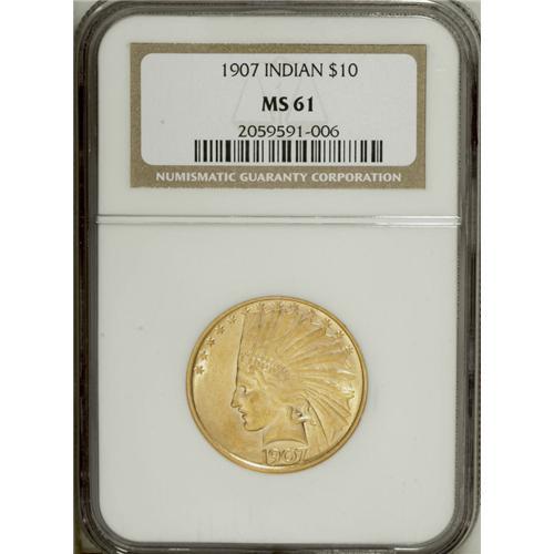 1907 $10 No Periods MS61 NGC. The yellow-gold surfaces