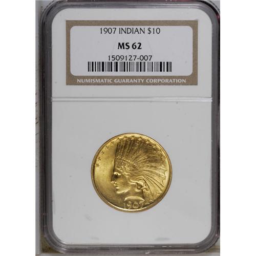 <B>1907<$10> No Periods MS62 NGC.</B></I> The lemon-yellow surfaces have shining luster, though the usual central striking weakness is present. A pretty piece from one of just a handful of No Motto eagle issues.
