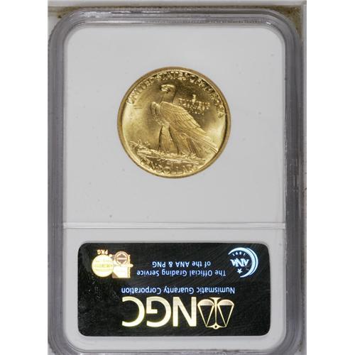 1907 $10 No Periods MS62 NGC. The lemon-yellow surface