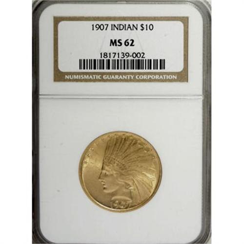 <B>1907 $10 No Periods MS62 NGC.</B></I> Luster gently glows over the surfaces which display fewer marks and imperfections than typically seen on gold tens in this grade. Particularly pretty for the grade.<BR><BR><B>Coin Engraver:</B> Augustus Saint-Gaudens<BR><BR><b>Shipping:</b> Coins & Currency (<a target="_blank" href="http://www.heritageauctions.com/common/shipping.php">view shipping information</a>)