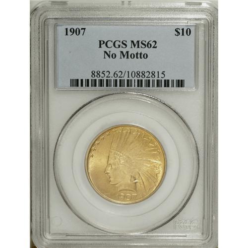 <B>1907 $10 No Periods MS62 PCGS.</B></I> Rich butter-yellow color is the hallmark of this highly lustrous eagle. The surfaces are lightly abraded, and a touch of softness is present on Liberty's hair.<BR><BR><b>Shipping:</b> Coin/Currency (<a target="_blank" href="http://www.heritageauctions.com/common/shipping.php">view shipping information</a>)