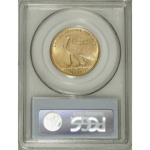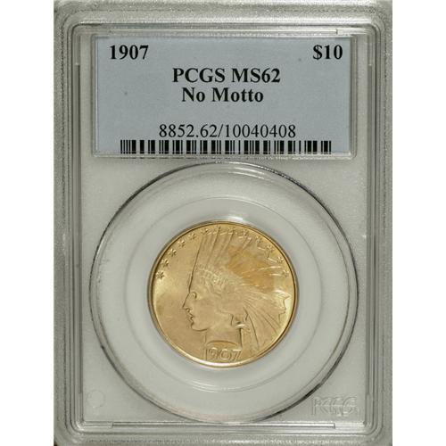 <B>1907 $10 No Periods MS62 PCGS.</B></I> Slightly weak in a few selected areas, with soft satin luster and clean surfaces for the grade. Mostly green-gold in color, except for a splash of sunset-orange on the upper headdress feathers.<BR><BR><b>Shipping:</b> Coins & Currency (<a target="_blank" href="http://www.heritageauctions.com/common/shipping.php">view shipping information</a>)