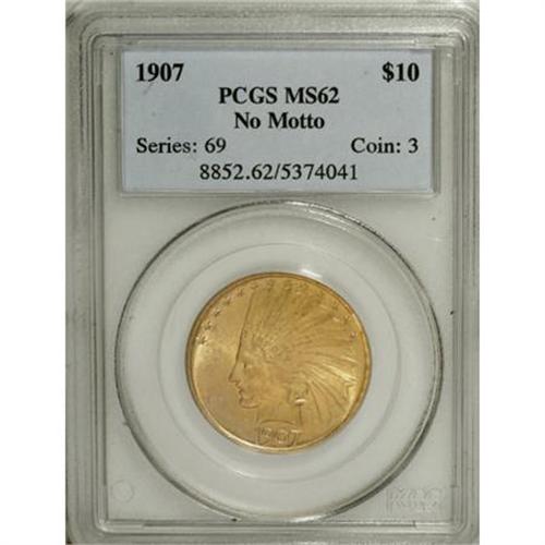 <B>1907 $10 No Periods MS62 PCGS.</B></I> PCGS Population (1283/1651). NGC Census: (1255/1596). Mintage: 239,400. Numismedia Wsl. Price for NGC/PCGS coin in MS62: $1,150. (#8852)<BR><BR><B>Coin Engraver:</B> Augustus Saint-Gaudens<BR><BR><b>Shipping:</b> Coins & Currency (<a target="_blank" href="http://www.heritageauctions.com/common/shipping.php">view shipping information</a>\)