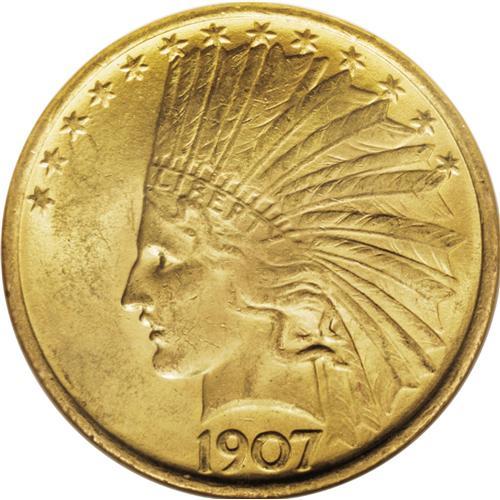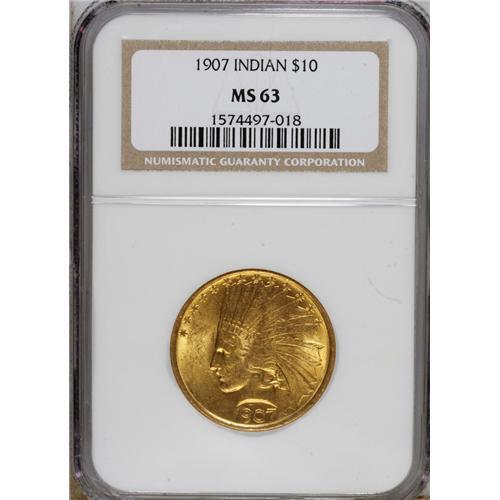 <B>1907 $10 No Periods MS63 NGC.</B></I> Lemon-gold in color, with darker highlights visible on some of the higher points and in the fields. A bit weakly struck over Liberty's ear, as often found, yet noticeable abrasions are at an absolute minimum for the grade. This is the final variety of eagle struck in the transitional year of 1907.<BR><BR><b>Shipping:</b> Coins & Currency (<a target="_blank" href="http://www.heritageauctions.com/common/shipping.php">view shipping information</a>)