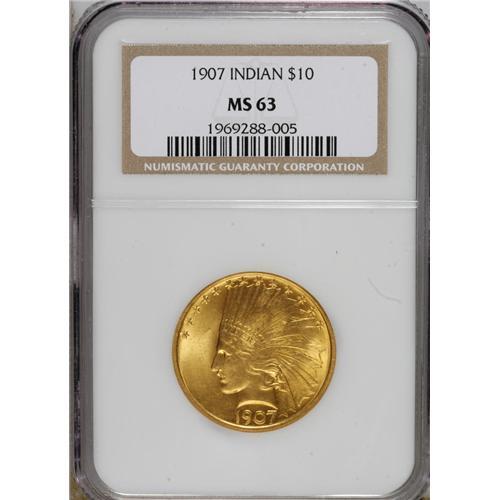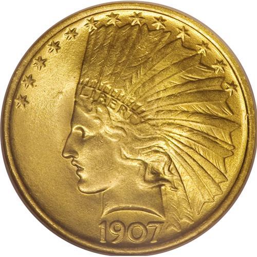 <B>1907 $10 No Periods MS63 NGC.</B></I> The alluring surfaces are instantly suggestive of a finer grade, even though close perusal with a loupe reveals a small patch of undistracting marks on the Indian's cheek, each minuscule and unworthy of singular mention. The orange-gold, mattelike surfaces are highly lustrous and the epitome of this first-year commercial design type. Justly deserving of a high-grade Mint State gold type set.<BR><BR><b>Shipping:</b> Coins & Currency (<a target="_blank" href="http://www.heritageauctions.com/common/shipping.php">view shipping information</a>)