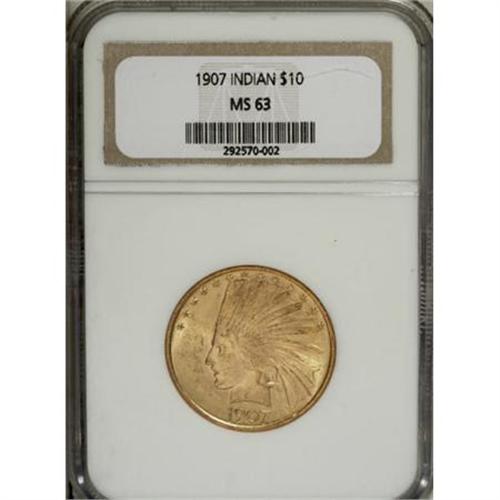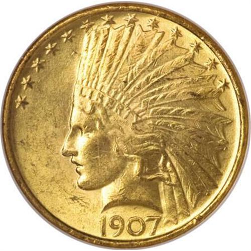 <B>1907 $10 No Periods MS63 NGC.</B></I> An attractive Select example of this desirable first-year issue, representative of the short-lived No Motto variety for the Saint-Gaudens design. The yellow-gold surfaces show subtle undercurrents of green and strong, slightly satiny luster. Wispy abrasions on the cheek and a few marks on the obverse rim preclude a finer designation.<BR><BR><B>Coin Engraver:</B> Augustus Saint-Gaudens<BR><BR><b>Shipping:</b> Coins & Currency (<a target="_blank" href="http://www.heritageauctions.com/common/shipping.php">view shipping information</a>)