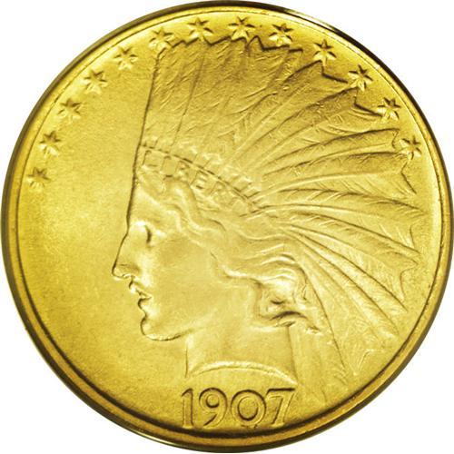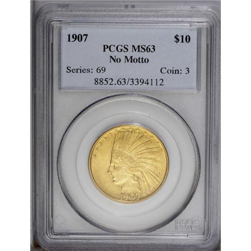 <B>1907<$10> No Periods MS63 PCGS.</B></I> Frosty brilliance with a decent, but not full, strike and scattered contact marks that prevent a higher grade. An ideal type coin selection.