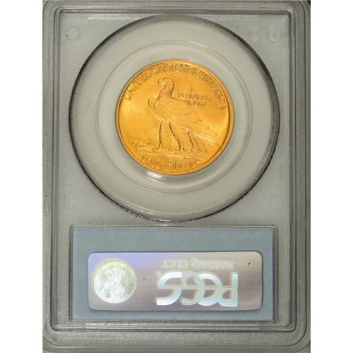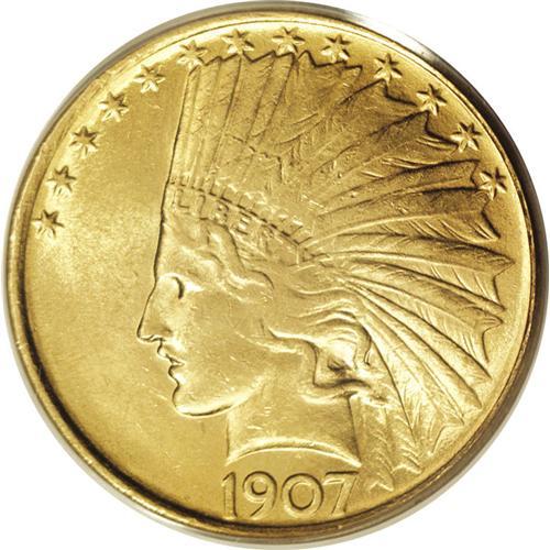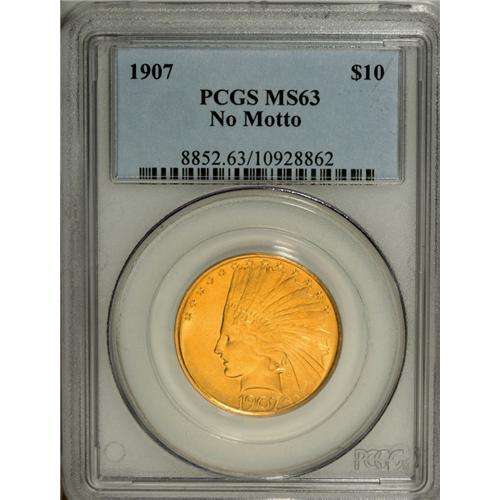 <B>1907 $10 No Periods MS63 PCGS.</B></I> This No Motto issue lacks the periods between and after E PLURIBUS UNUM. This particular MS63 specimen displays gorgeous peach-gold color and blazing luster. The design elements are sharply impressed, with no areas revealing noticeable weakness. There are a few unobtrusive contact marks, none of which are worthy of individual mention.<BR><BR><b>Shipping:</b> Coin/Currency (<a target="_blank" href="http://www.heritageauctions.com/common/shipping.php">view shipping information</a>)