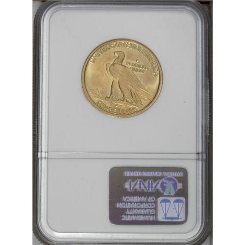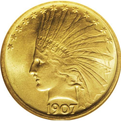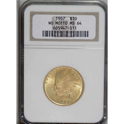 <B>1907 $10 No Periods MS64 NGC.</B></I> A lack of periods between the words of E PLURIBUS UNUM distinguishes this relatively common issue from its much more elusive counterparts. The highly lustrous butter-yellow surfaces of this near-Gem are tinged with reddish-orange. Aside from some central striking weakness on the obverse and a few trivial marks, this example is largely untroubled.<BR><BR><b>Shipping:</b> Coin/Currency (<a target="_blank" href="http://www.heritageauctions.com/common/shipping.php">view shipping information</a>)