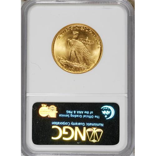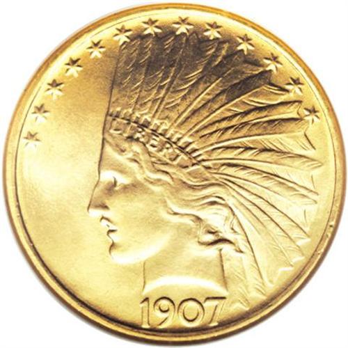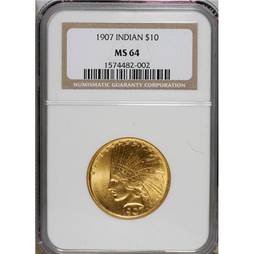 <B>1907 $10 No Periods MS64 NGC.</B></I> This is the standard variety for the year with no periods in the legends and no motto on the reverse. The No Motto design type was only issued in 1907 and 1908, and it is an important sub-type within the series of Indian eagles. The surfaces are brilliant and satiny with fully lustrous yellow-gold on each side.<BR><BR><b>Shipping:</b> Coins & Currency (<a target="_blank" href="http://www.heritageauctions.com/common/shipping.php">view shipping information</a>)