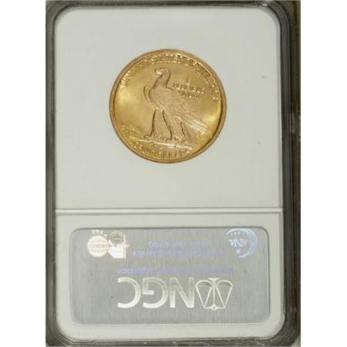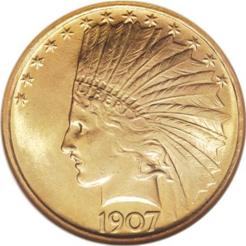 <B>1907 $10 No Periods MS64 NGC.</B></I> Never let it be said that coin collecting is an unemotional business. While a coin such as the present piece inspires an instant emotional response--"Oh, how wonderful, I need it, I want it"--a coin cataloger's job is to objectify that emotional response, translating it into quantifiable, understandable terms for potential bidders. The glorious luster is nearly unparalleled for the issue, and is the chief source of unqualified admiration. Frosty yellow-orange surfaces, with a dash of satiny velvet on the reverse, also contribute, and the couple of tiny ticks on the Indian's cheek fail to distract. Worth spirited--and emotional--bidding.<BR><BR><b>Shipping:</b> Coins & Currency (<a target="_blank" href="http://www.heritageauctions.com/common/shipping.php">view shipping information</a>)