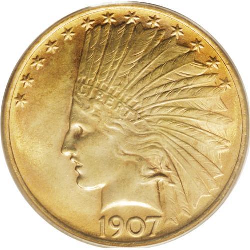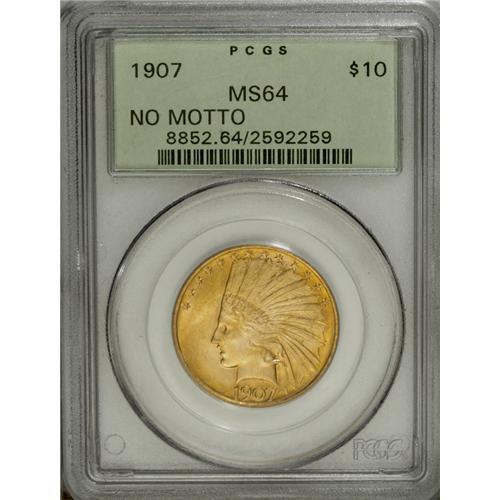 <B>1907 $10 No Periods MS64 PCGS.</B></I> A beautiful lemon-gold type coin from the introductory year of the Indian design. Lustrous and refreshingly free from all but the most trivial marks. The strike is particularly bold on the eagle's plumage. Encapsulated in a green label holder.<BR><BR><b>Shipping:</b> Coin/Currency (<a target="_blank" href="http://www.heritageauctions.com/common/shipping.php">view shipping information</a>)